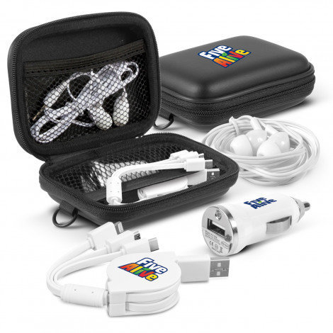 Very handy accessory kit for electronic devices in a smart EVA carry case. It contains a Mini USB Car Charger, a set of earbuds and a retractable triple connector cable for charging only. All the items can be branded except for the earbuds.