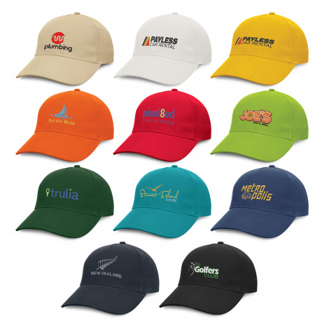 Premium quality, structured five panel cap which is manufactured from cotton canvas. It features embroidered eyelets, a pre-curved peak a sweat band and an adjustable Velcro closure which allows one size to fit most people.