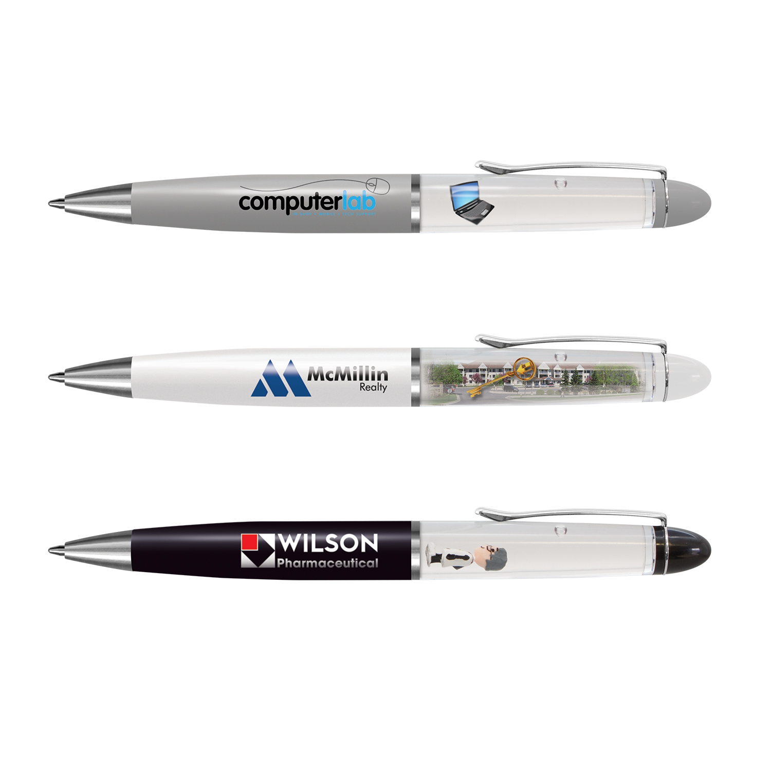 Brass barrel, liquid-filled floating action ball pen with a twist mechanism and the choice of a blue or black refill. It can be configured with an insert panel which is printed in full colour on both sides along with a customised 2D floater that moves vertically when the pen is inverted. The other option is a 3D floater without the insert panel which requires a mould charge. The barrel can be manufactured in any PMS colour for an additional charge. A lead time of 30 working days applies to this product by air freight.