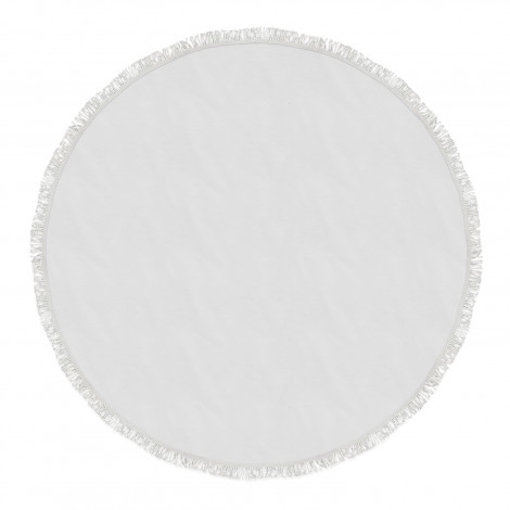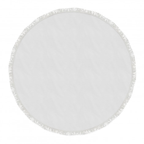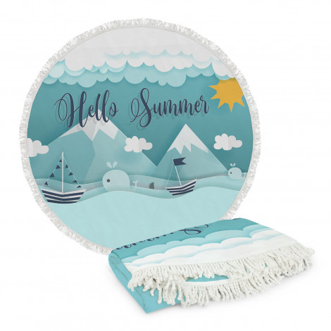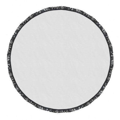 Trendy 1500mm round beach towel with white or black tassels which is manufactured from fast drying 240gsm polyester. It can be branded on one side with stunning edge-to-edge spot colours or full colour print. A production lead time of 20 working days applies to this product by air freight and larger orders can be sea freighted on request to reduce the freight cost.