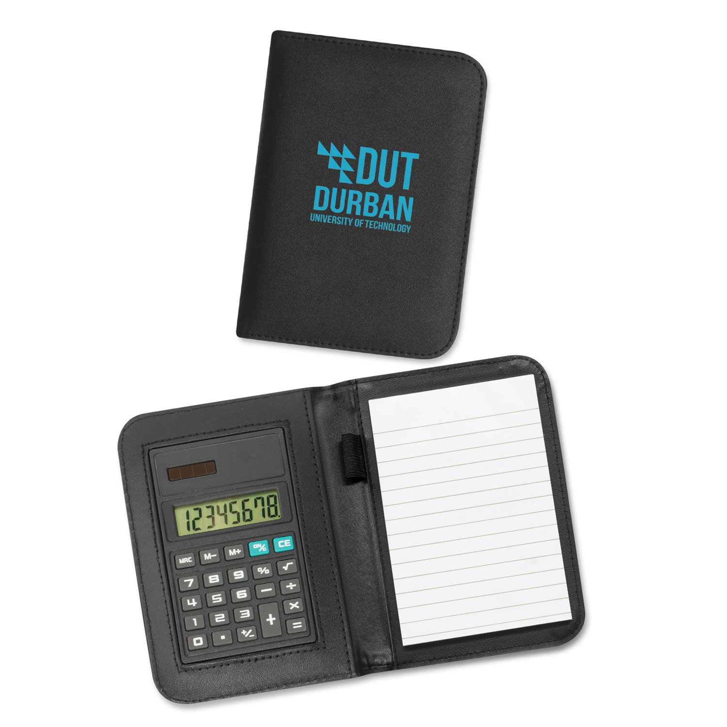 Small PU portfolio with a calculator and a lined pad. It laser engraves to a matt brown finish.