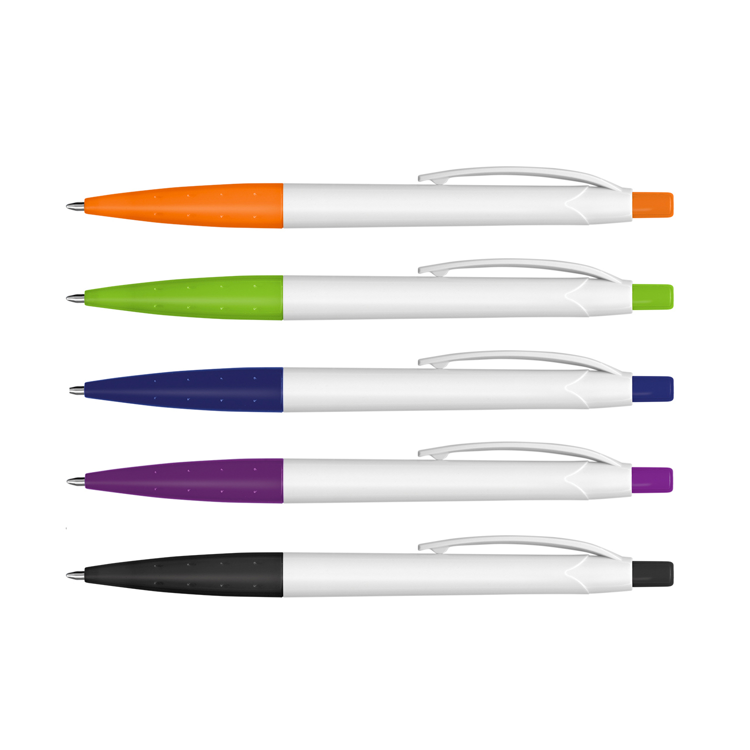 Retractable plastic ball pen with a white barrel. It has a black Trends refill with 1200 metres of German manufactured Dokumental ink and a tungsten carbide ball for improved writing quality.