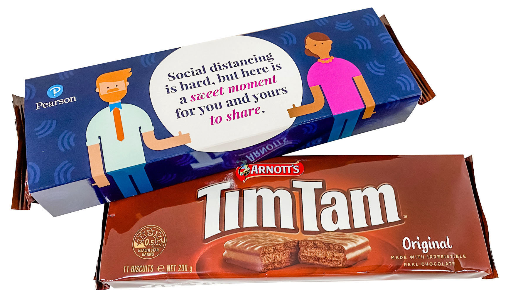 Fully Customised printed sleeve Please note, Tim Tams deals happen all the time, please email me your request at the time and Ill see what I can offer Arnott's Tim Tam Original Chocolate, made with irresistible real chocolate. The most irresistible chocolate biscuit. A mouth-watering combination of crunchy biscuit, creamy filling and real chocolate coating, it's easy to see why Tim Tams are Australia’s most-loved chocolate biscuit. Share a packet of these deliciously sweet biscuits with your friends and family today.