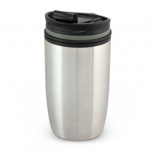 Sleek BPA-free 300ml double wall coffee cup which has a stainless steel outer wall and a polypropylene inner wall. It will keep drinks hot or cold for longer and has a secure screw on lid with a splashproof flip closure. The white and black cups laser engrave to a shiny steel finish and the stainless steel cup laser engraves to a natural etch. Vento has a soft non-marking base and can be presented in an optional black gift box. This product is not dishwasher safe and handwashing is recommended.