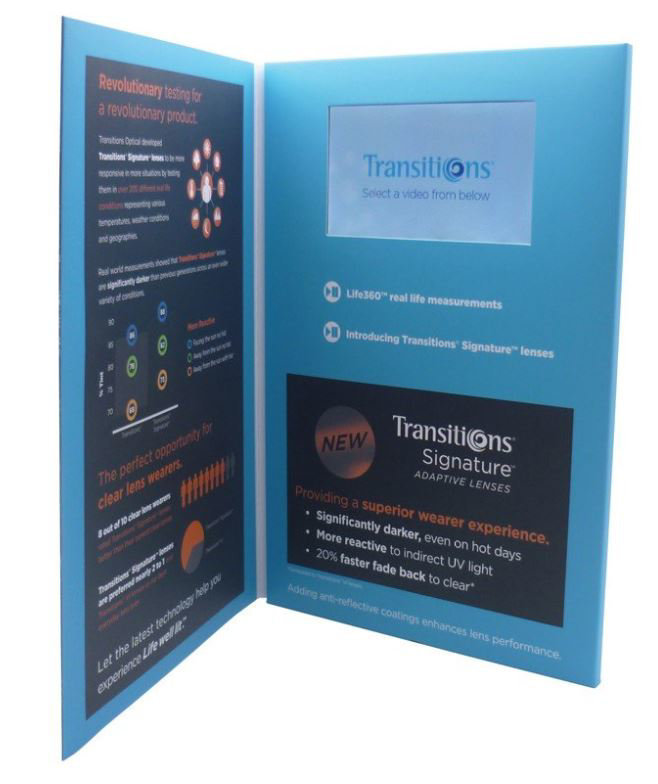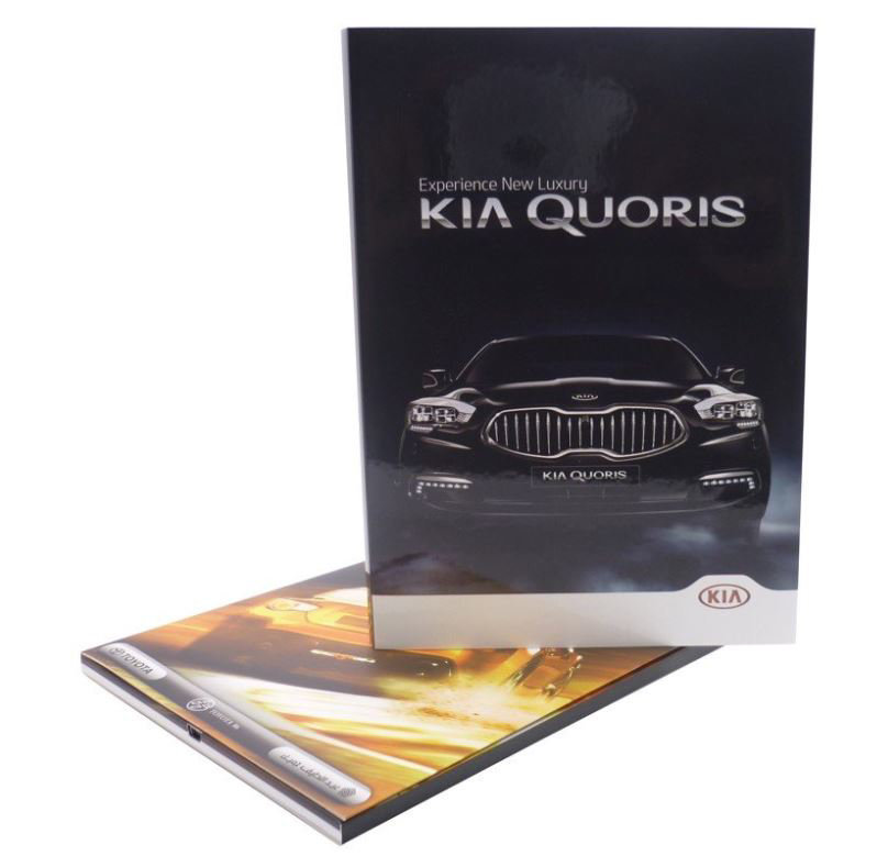 Utilising Hall Effect sensors the pre-loaded video presentation will auto play when this catalogue is opened. Offering a full colour print in matt or gloss finish this catalogue includes; a 4.3 inch LCD panel with 480 x 272 pixel resolution, 256 MB capacity for a 15 min play time and rechargeable battery 500 mAh with 2 hour capacity. USB charge cable included. Extra options POA - start-up logo, multiple videos, mailing cover, volume, pause, stop, f/fwd, chapter buttons, increased memory and battery capacities, UV and foil finishes. Certification: CE, FCC, USB2.0, RoHS Standard Packaging: Bubble bag Product Size: (A5) 210 x 148 x 8.5 mm Print Area: All exposed sides Print Process: Offset print Delivery: 3-4 weeks (indent) from art approval Packing Details: 40 pcs per carton, 20 Kgs, 66x36x33 cms